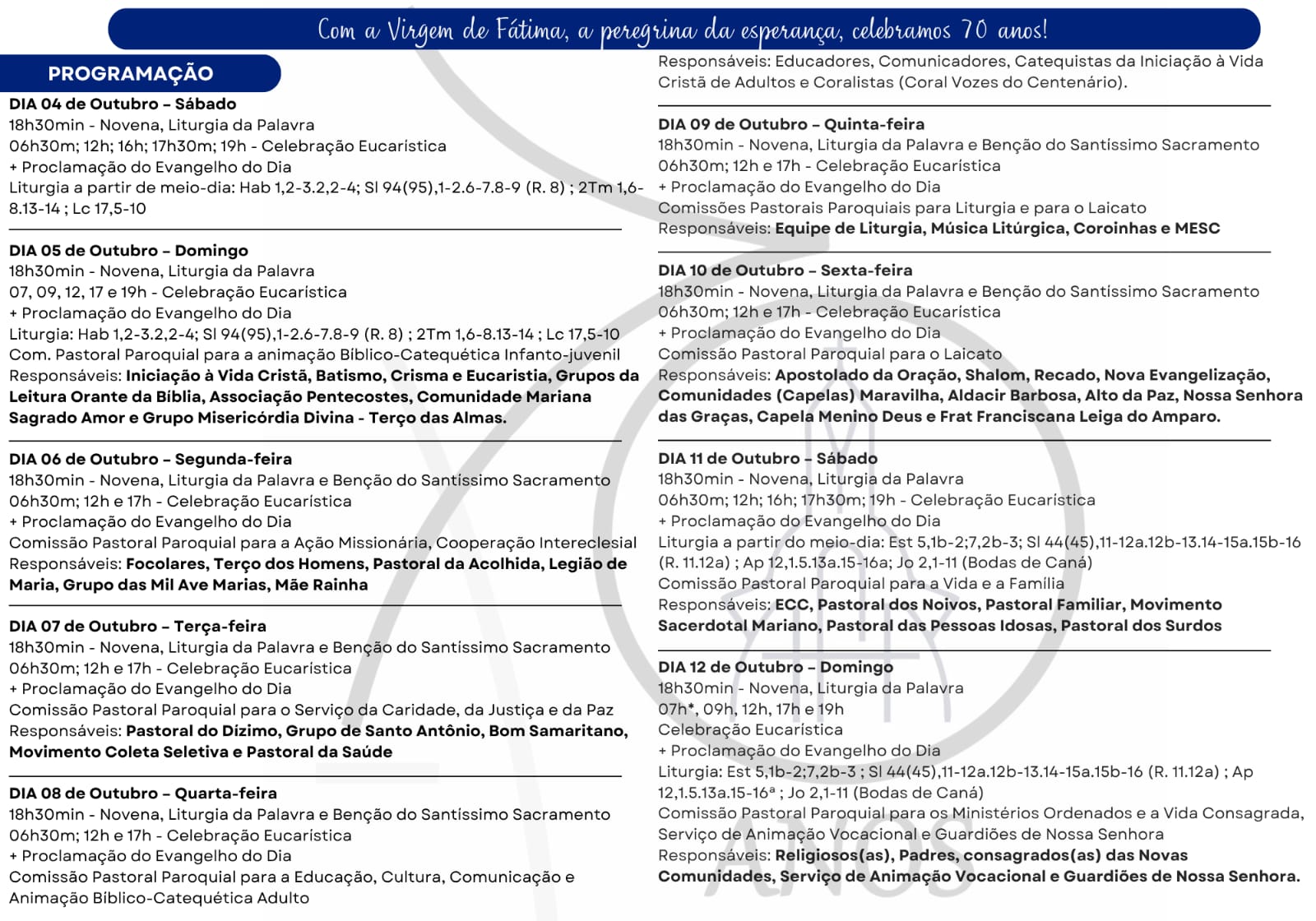 04 a 12 de outubro – Novenário Paróquia e Santuário Nossa Senhora de Fátima 13 de Outubro, Celebrações Eucarísticas e procissão!